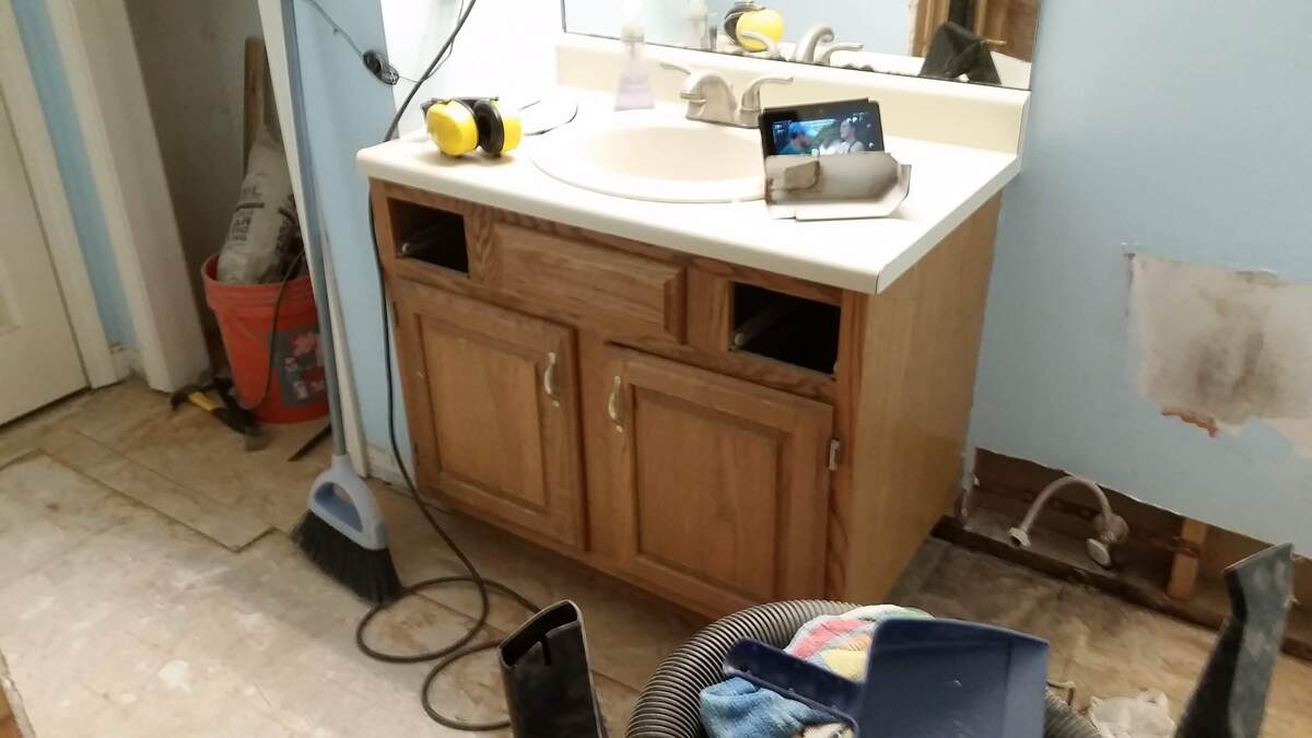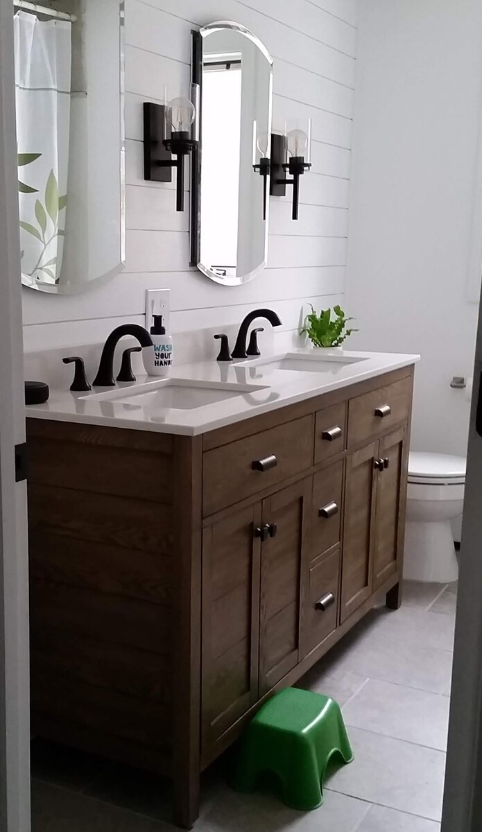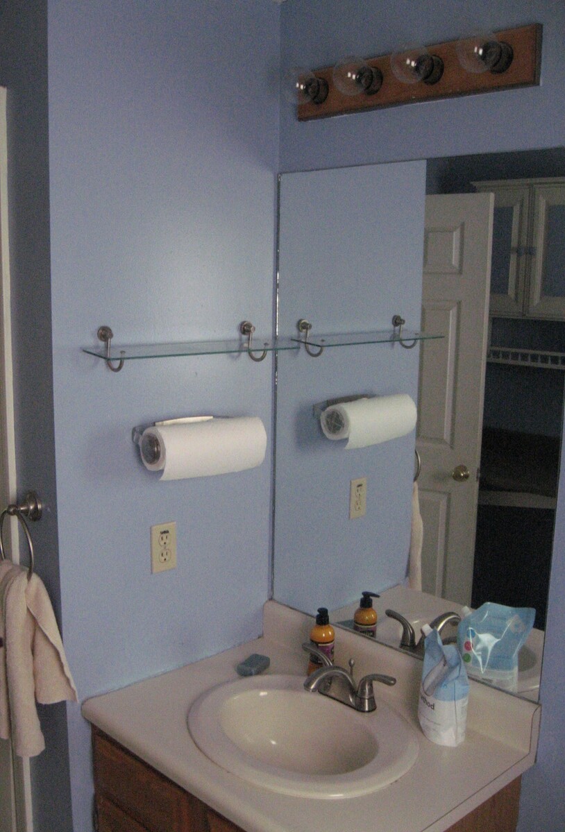 The storage closest was removed and storage relocated to two medicine cabinet mirrors and vanity storage. This allows for a double vanity to be installed, so all 6 kids to brush their teeth at once.