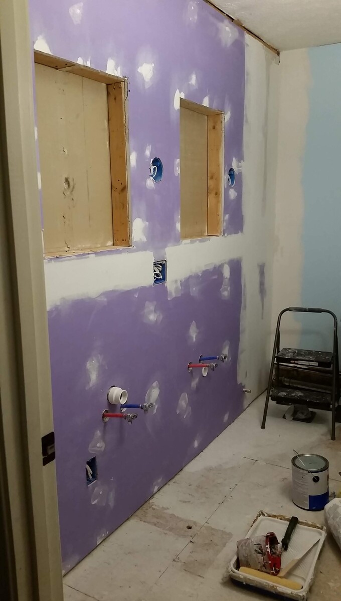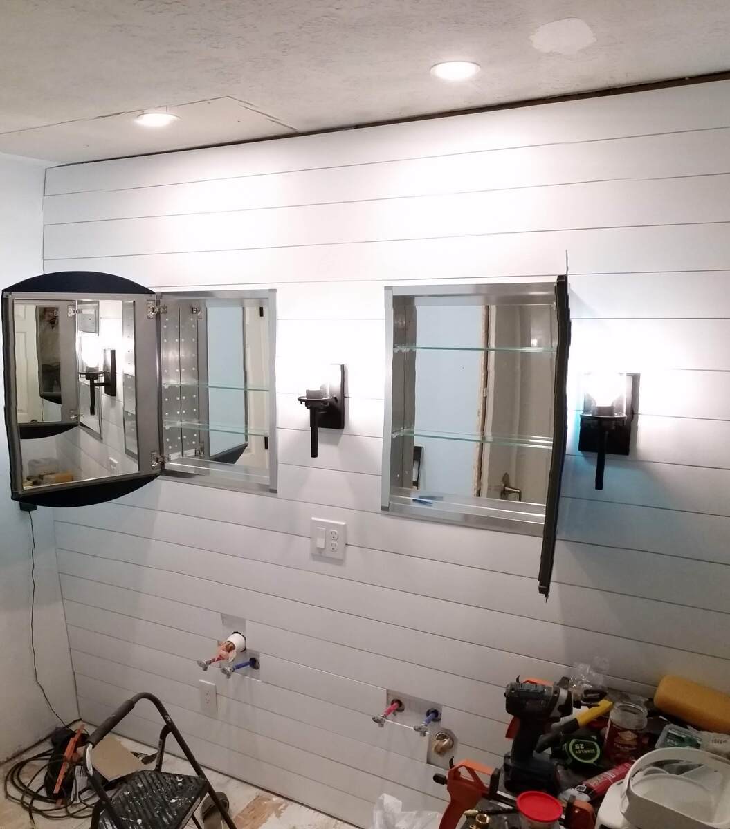 The storage closest was removed and storage relocated to two medicine cabinet mirrors and vanity storage. This allows for a double vanity to be installed, so all 6 kids to brush their teeth at once.
